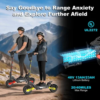 Dual battery options (48V 13AH/23.4AH) with extended range (20/40 miles) — – Flexible battery configurations adapt to daily commutes or extended adventures, accommodating diverse usage scenarios.